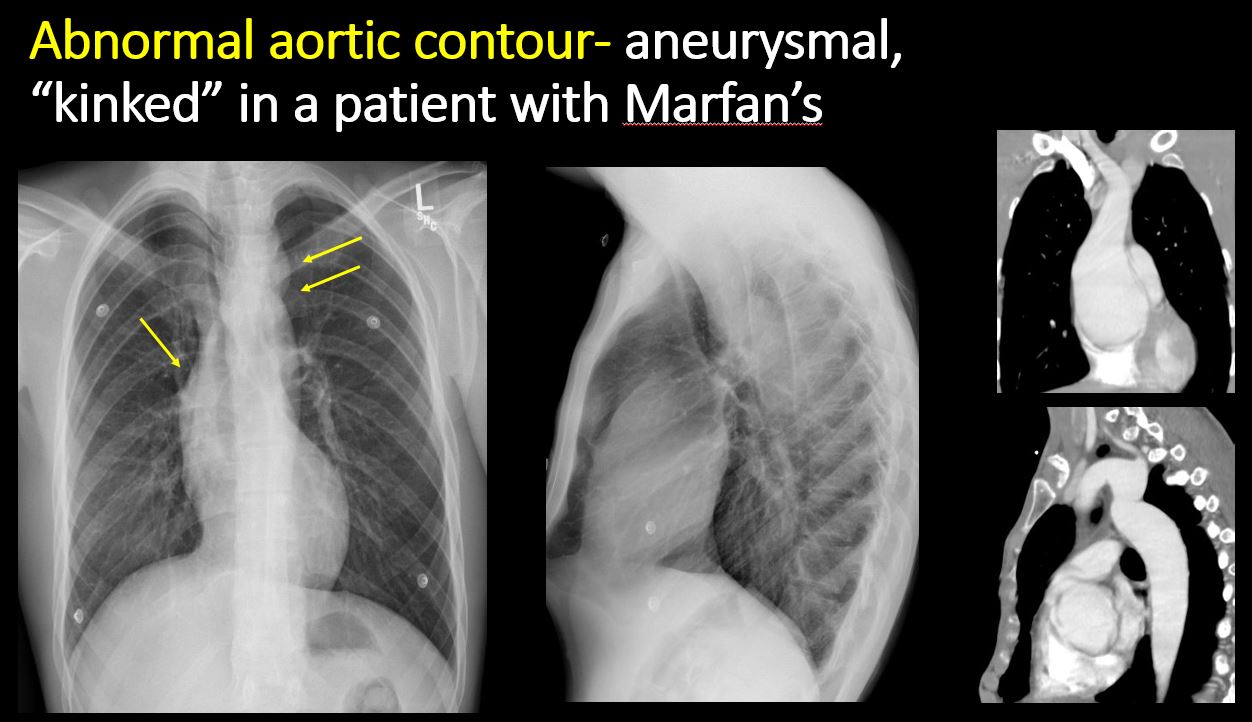 The aorta is dilated, tortuous, ectatic, calcified, or there is a focal contour abnormality. |