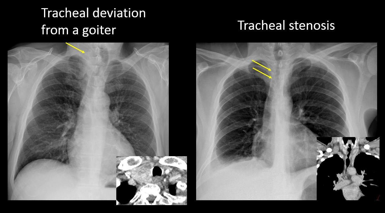 There is abnormal tracheal deviation or narrowing on the frontal and/or lateral view. |