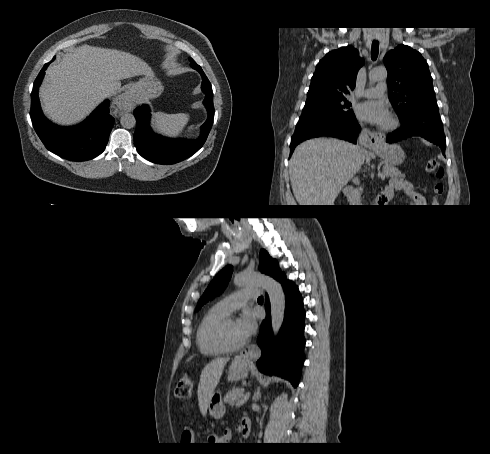 The patient has a sliding hernia considering the GE junction has moved above the esophagus. This is compared to a paraesophageal hernia, where part of the stomach or other organs herniate into the chest cavity.