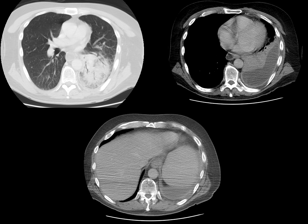 BP: 127/70, HR 104, RR 22, Temp 40.0C, O2 saturation 88%. General: Increased work of breathing. Lungs: reduced breath sounds, decreased tactile fremitus, and dullness to percussion in left lower lung field. Remainder of exam unremarkable.