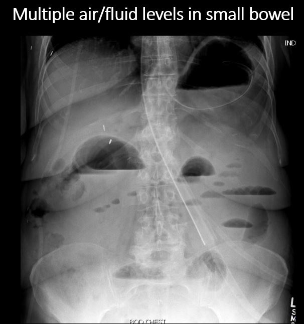 There are more than 3 air/fluid levels or “string of pearls (beads) sign” involving the small bowel. [Yes/No]