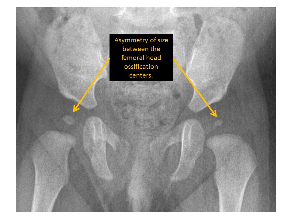 There is abnormal osseous density of the femoral epiphyseal ossification centers. [Yes/No]